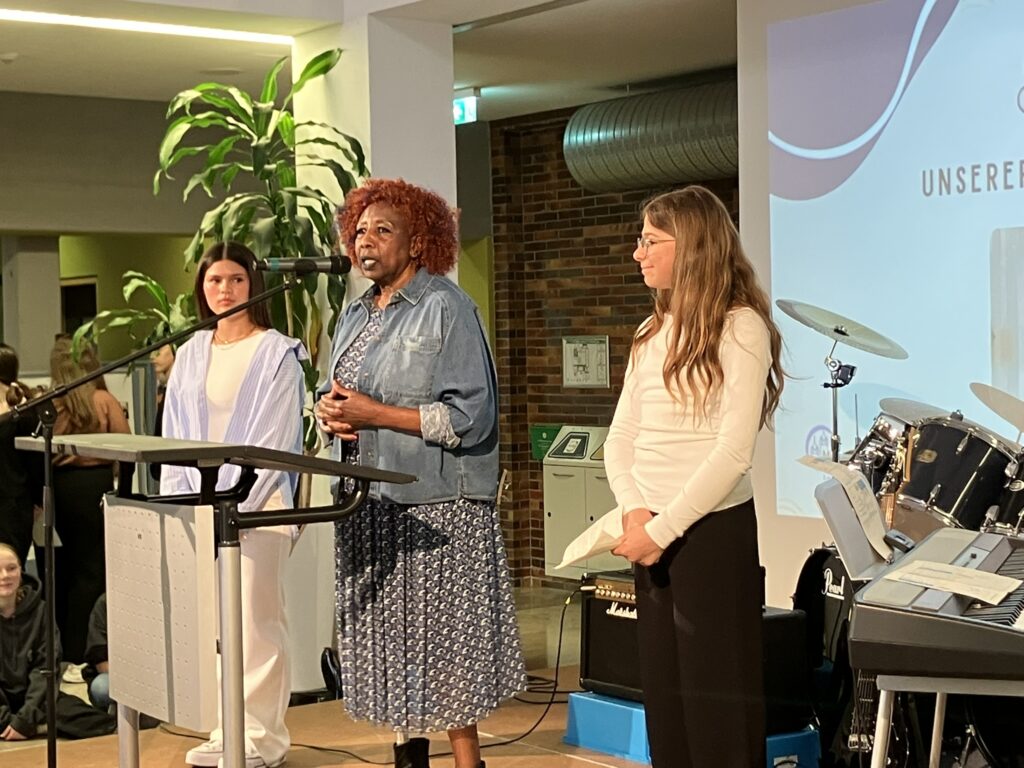 Die erste Patin der Schule Asha Noppeney, die auch regelmäßig Patin beim Lauf für Kaya ist, erzählte eine bewegende und eindrucksvolle Geschichte über Mut und Verständnis. In einer persönlichen und berührenden Erzählung sprach sie über eigene Erfahrungen mit Rassismus, über Ängste, die Menschen voneinander trennen, und über die Kraft des Zuhörens. Ihre Worte schufen eine Atmosphäre, in der Nachdenklichkeit und Hoffnung eng beieinander lagen.