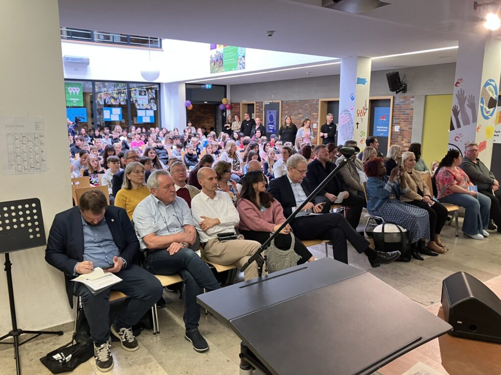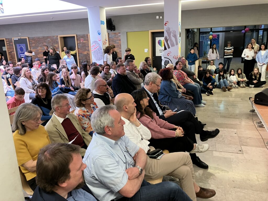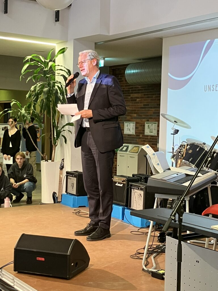 Anschließend gab es Grußworte aus Politik und Schule. Der Bürgermeister German Hacker würdigte in seinem Grußwort das Engagement der Schulgemeinschaft und betonte die Bedeutung des Titels in einer Zeit, in der demokratische Werte nicht selbstverständlich sind.