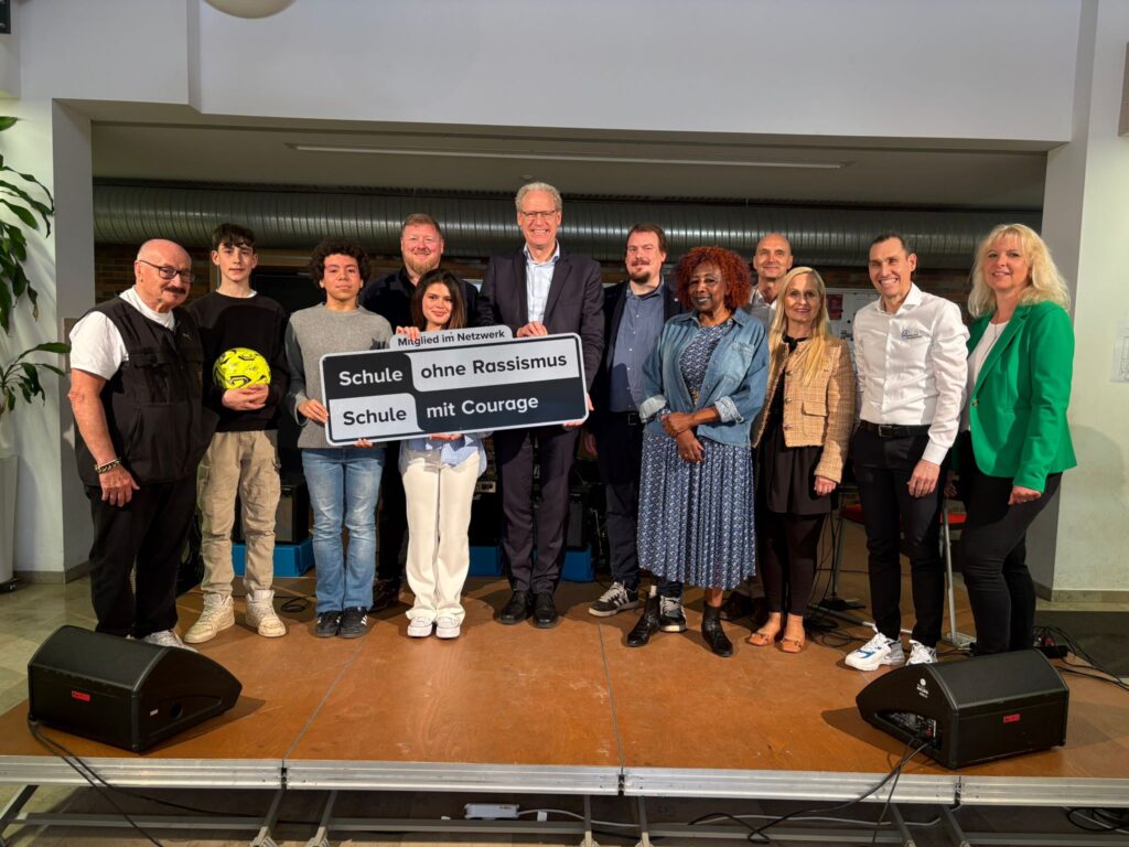 Anschließend wurde die Urkunde und das Schulschild „Schule ohne Rassismus – Schule mit Courage“ feierlich von Regionalkoordinator Christian Löbel übergeben. Er betonte, dass der Titel ein Auftrag sei und ein Weg, den die Schule gemeinsam weitergehen muss.